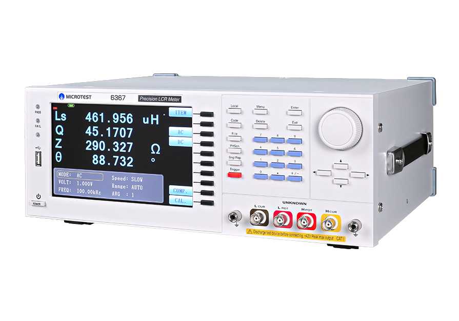 MICROTEST 6360系列提供20k/100k/500k/1MHz量測頻率,量測參數包含|Z|(阻抗)、|Y|(導納)、θ(相位角)、X(電抗)、R(串並聯電阻)、G(電導)、B(電納)、L(電感)、D(損耗因數)、Q(品質因數)、DCR(直流電阻) 、C(電容),支援RS-232、Handler、LAN、USB Host 、Handler通訊接口,可透過USB存儲測試畫面與數據,選購PC連線軟體可支援掃圖分析功能,是一款元件阻抗基礎測量的最佳選擇。
