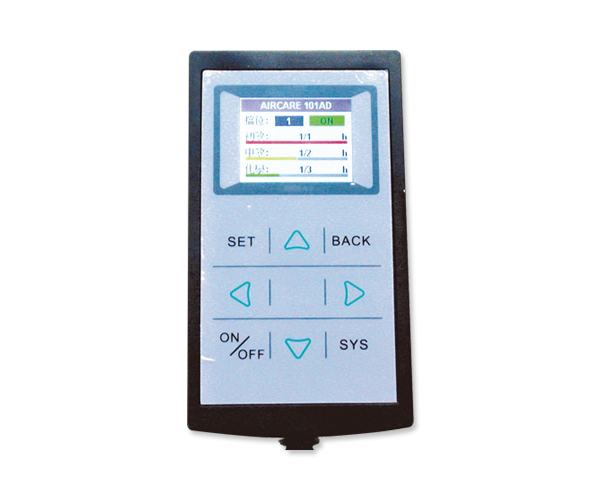 ˙手持式控制盒,LCD顯示3組跑馬燈條計時,分別監測三個主過濾器。