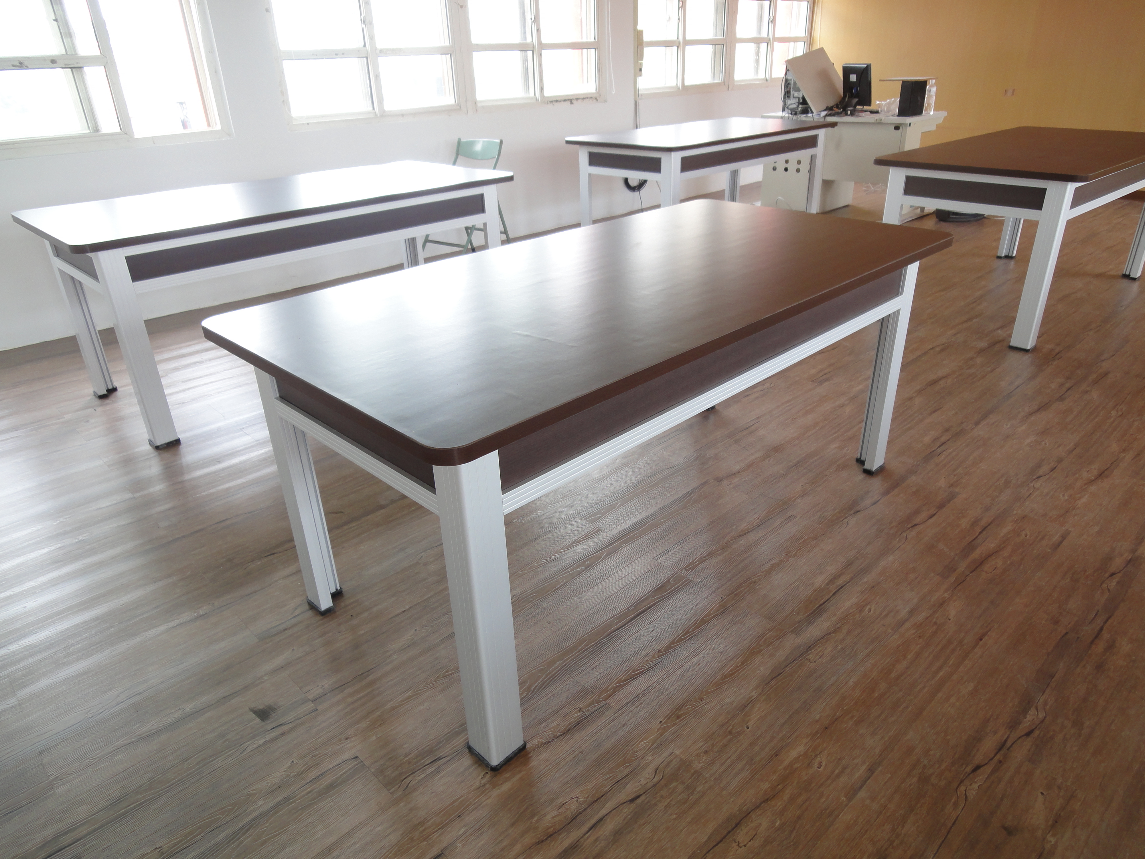 - 桌面採用36mm厚度之熱壓夾板,上貼美耐板,四周邊緣須加裝與桌面同厚度之ㄇ型鋁框固定,四個桌面角落並且用不銹鋼轉角器加以固定,以避免桌面邊緣的美耐板受到損傷,並可保護使用者不至受到意外的碰傷,增加桌子的安全性。