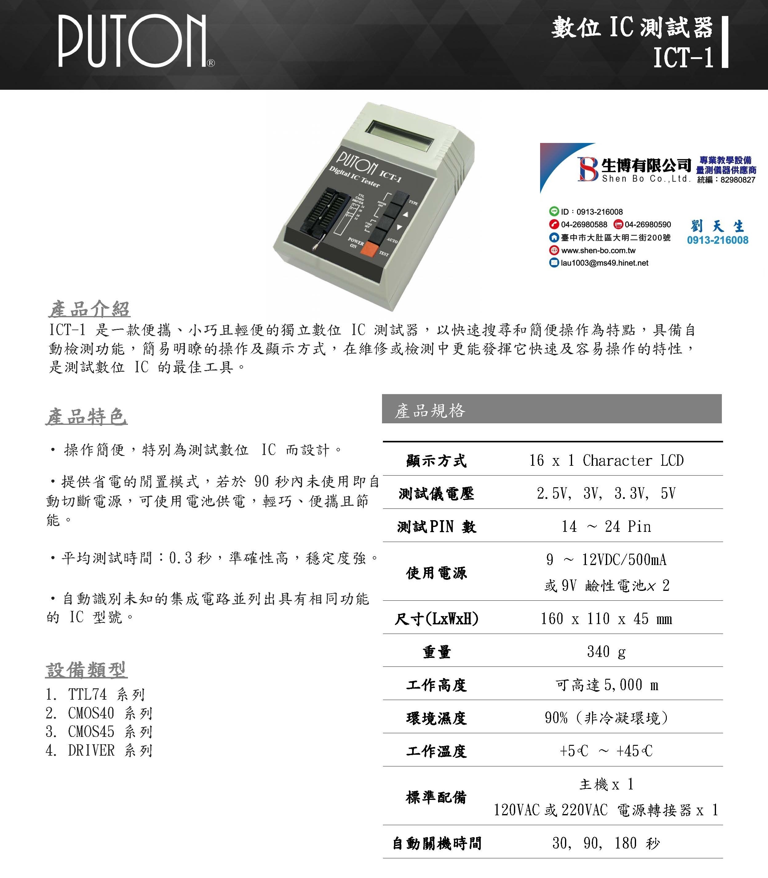 ICT-1 是一款便攜、小巧且輕便的獨立數位 IC 測試器,以快速搜尋和簡便操作為特點,具備自動檢測功能,簡易明瞭的操作及顯示方式,在維修或檢測中更能發揮它快速及容易操作的特性,是測試數位 IC 的最佳工具。